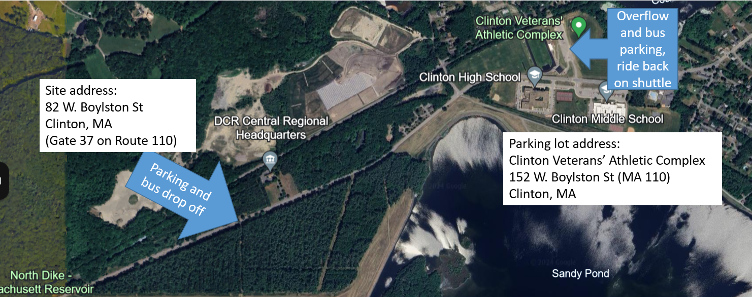 152 W. Boylston St (MA 110) Clinton MA Map link (Clinton Veterans’ Athletic Complex) and there will be a shuttle to get you back to Gate 37.